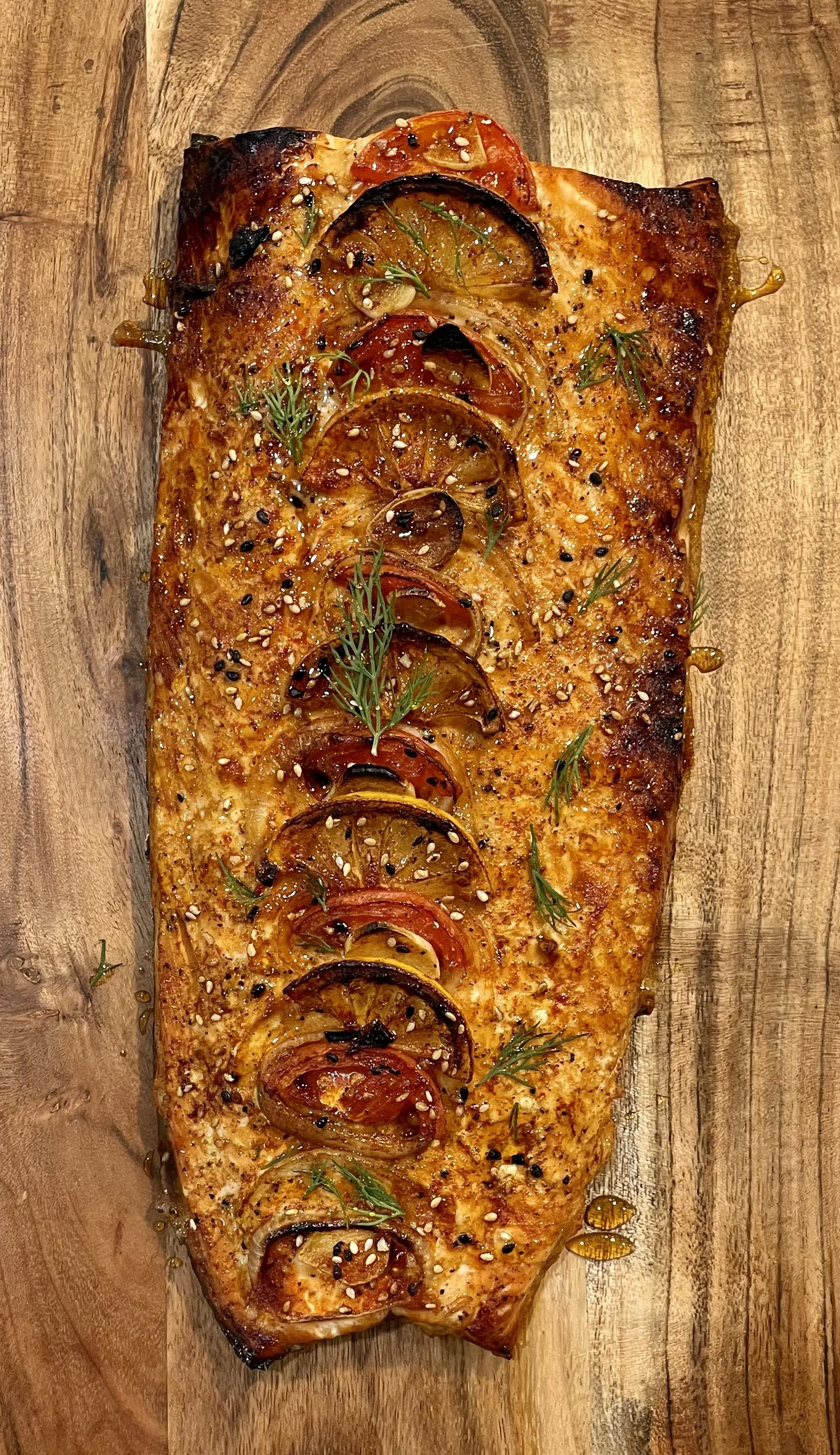 5. Place the mixture on top of the Salmon, cut lemon and tomatoes in slices and place on top of the salmon!